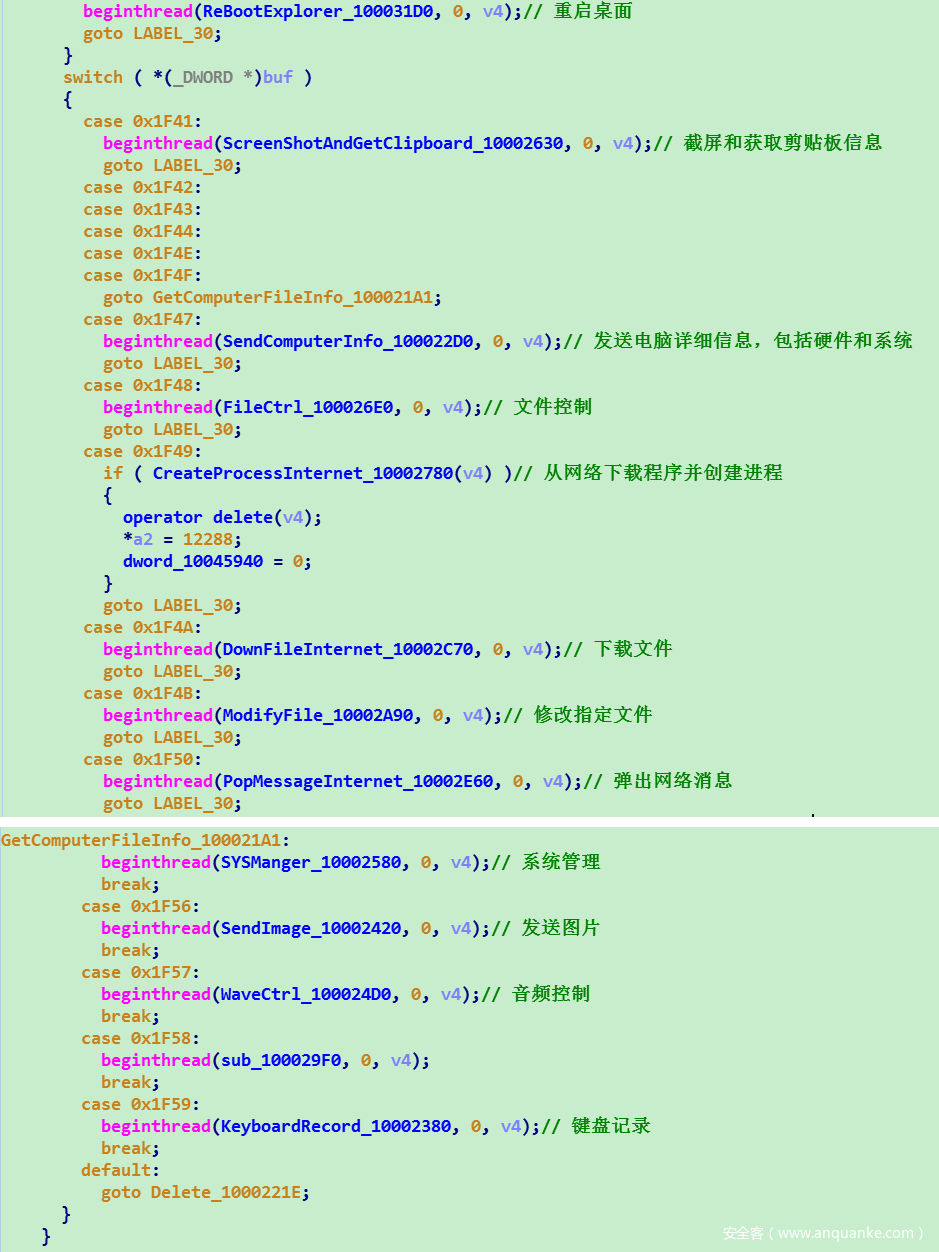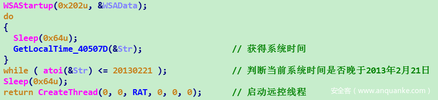 4)创建三个远控线程。三个线程的控制功能是一致的,但连接的服务器不同,此外前2个线程会验证系统时间,当时间大于2013/2/21才会创建控制线程。