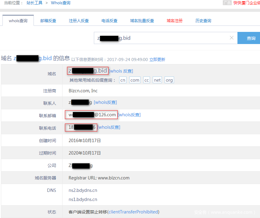 通过对恶意样本的分析,找到了域名z*******g.bid,通过域名反查定位到域名相关的注册邮箱和联系电话。