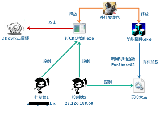 该荒野求生辅助被用户下载运行后会释放运行两个木马文件:“过CRC检测.exe”和“防封插件.exe”。其中“防封插件.exe”,是一个远控木马,可以窃取用户电脑中的信息,下载执行任意文件。另外一个“过CRC检测.exe”,是一个DDOS木马,根据黑客指令进行定向攻击。