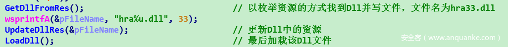 2)释放hra33.dll(这是一个lpk劫持dll),紧接着便更新dll的资源,然后加载dll。