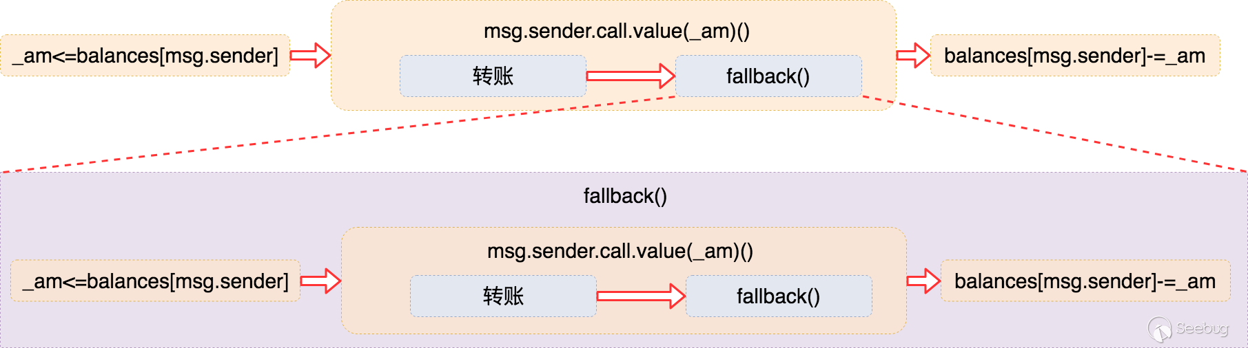 先将账户余额转给合约的创立者,然后再将剩余的账户余额(也就是0)转给转账的用户(受害者)