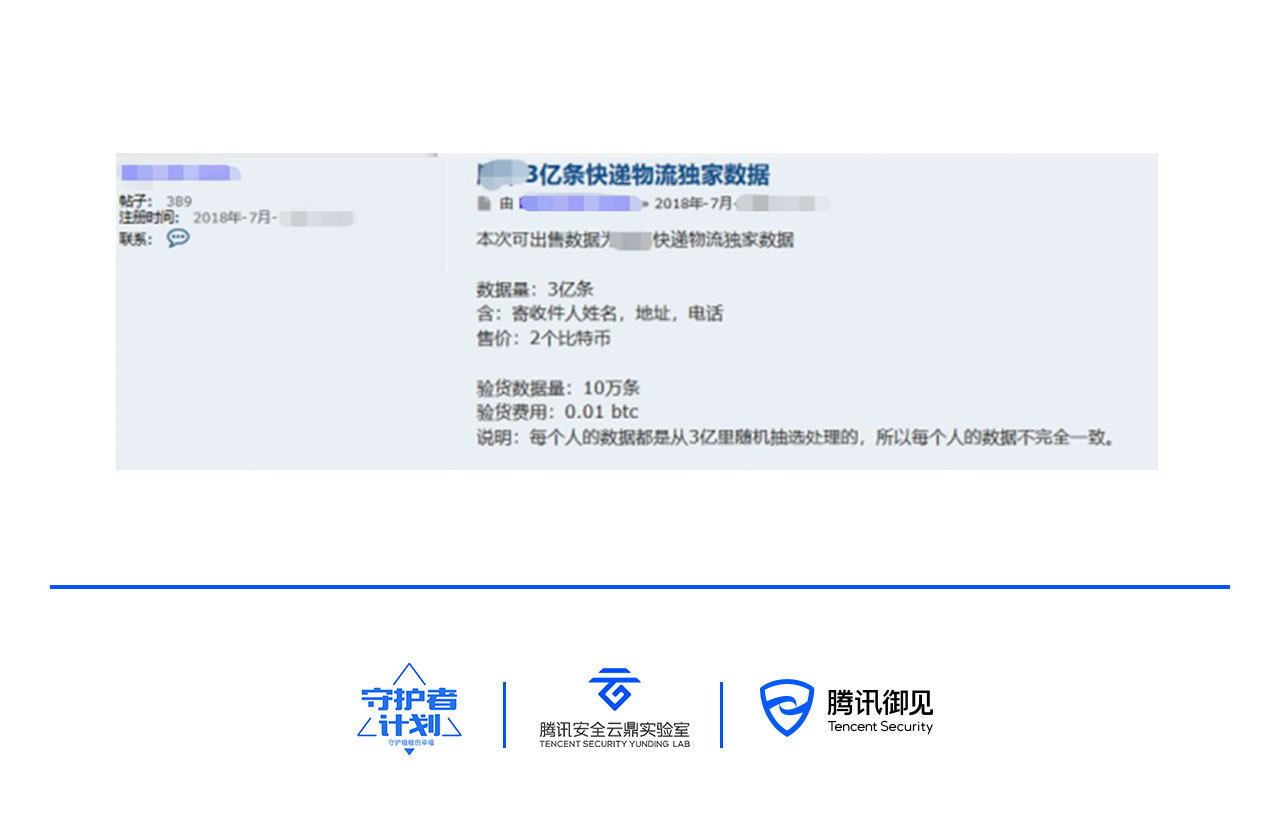 2、2018年7月,有人叫卖3亿条某快递公司用户数据,售价2个比特币;