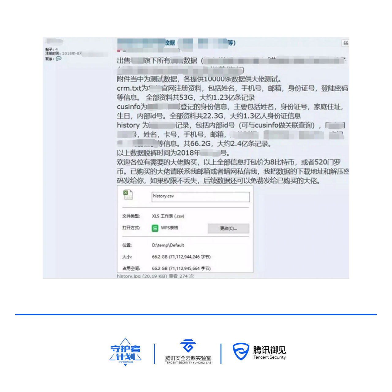 3、2018年8月,某省1000万学籍数据发生泄露并出现在暗网上;而后,又有人兜售某在美上市公司数亿用户数据,售价为8个比特币或520个门罗币;