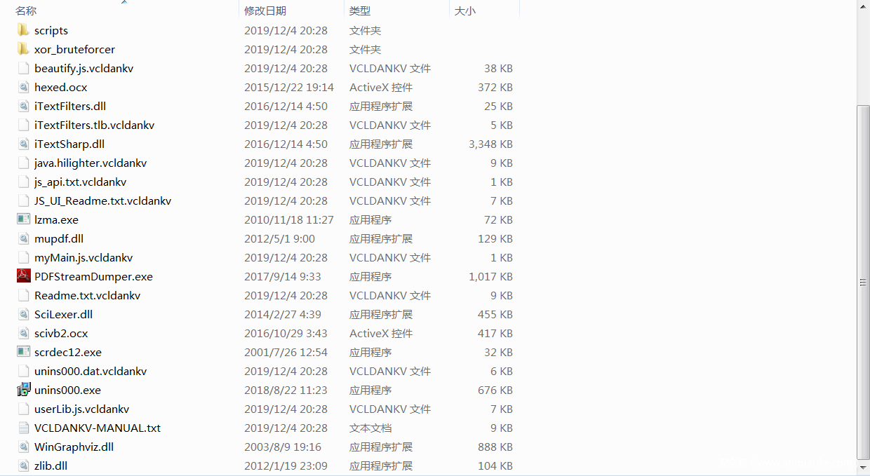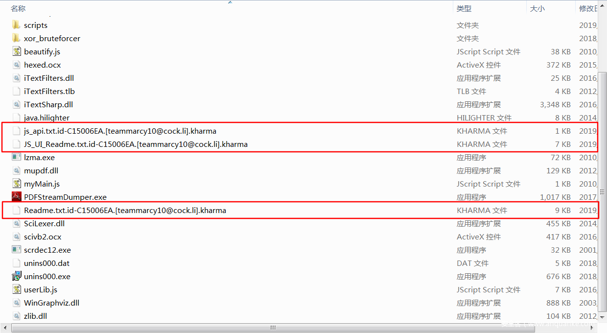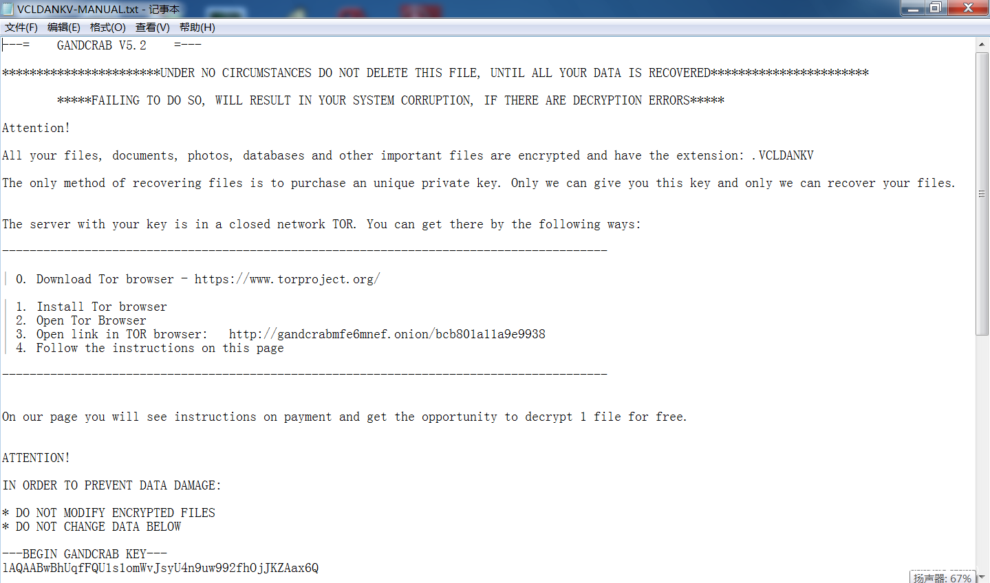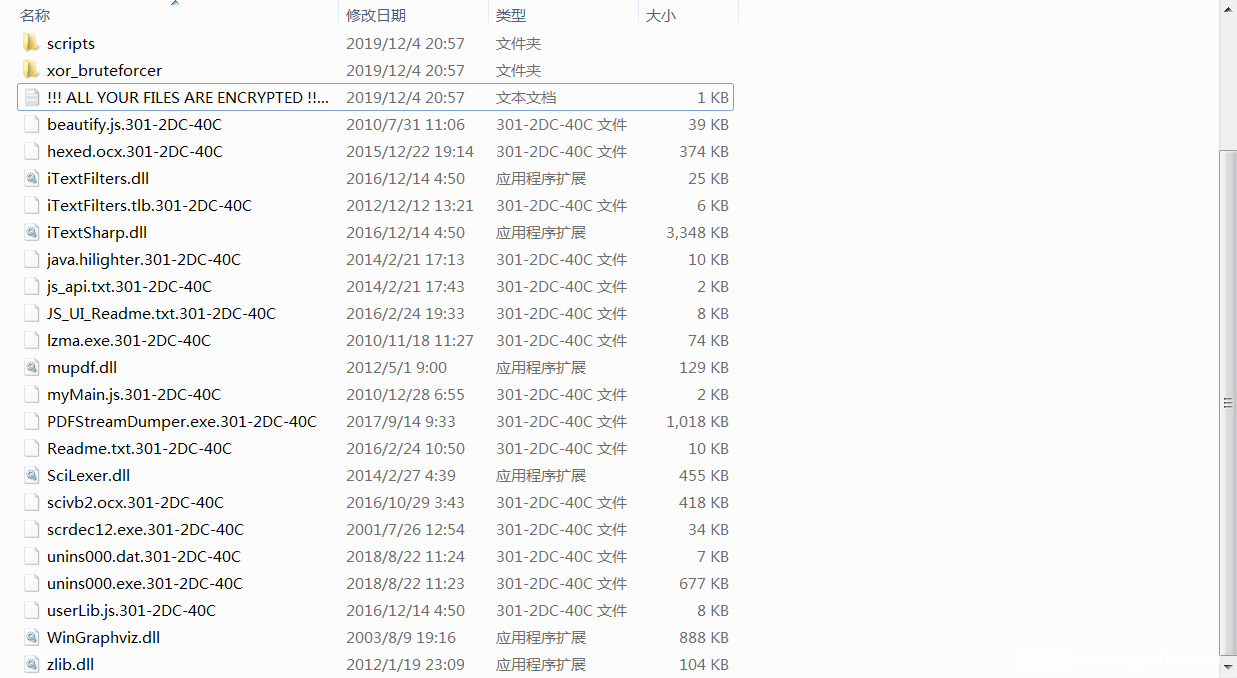GandCrab勒索病毒于2018年1月首次被观察到感染了韩国公司,随后GandCrab在全球迅速扩大,包括2018年初的美国受害者,至少8个关键基础设施部门受到此勒索病毒的影响,GandCrab也迅速成为最流行的勒索病毒,估计到2018年中期该勒索病毒已经占据勒索软件市场份额的50%,专家估计GandCrab在全球范围内感染了超过500,000名受害者,造成超过3亿美元的损失,GandCrab使用勒索软件即服务(RaaS)商业模式运营,通过将恶意软件分发给购买勒索病毒服务的合作伙伴,以换取40%的赎金,从2018年1月到2019年6月,此勒索病毒多现了多个不同的变种版本,2019年1月,此勒索病毒GandCrab5.1变种版本开始在全球流行,直到2019年6月1日,GandCrab勒索病毒运营团队宣布关闭他们的网站,并声称他们已经赚了20亿美元赎金,两周之后,Bitdefender与欧州刑警组织、联帮调查局、众多执法部门以及NoMoreRansom机构合作,发布了GandCrab勒索病毒的解密工具,可以适用于GandCrab1.0、4.0、5、5.2等版本,此勒索病毒的故事就此结束,加密后的文件,如下所示: