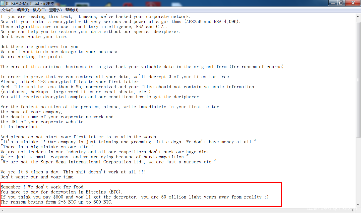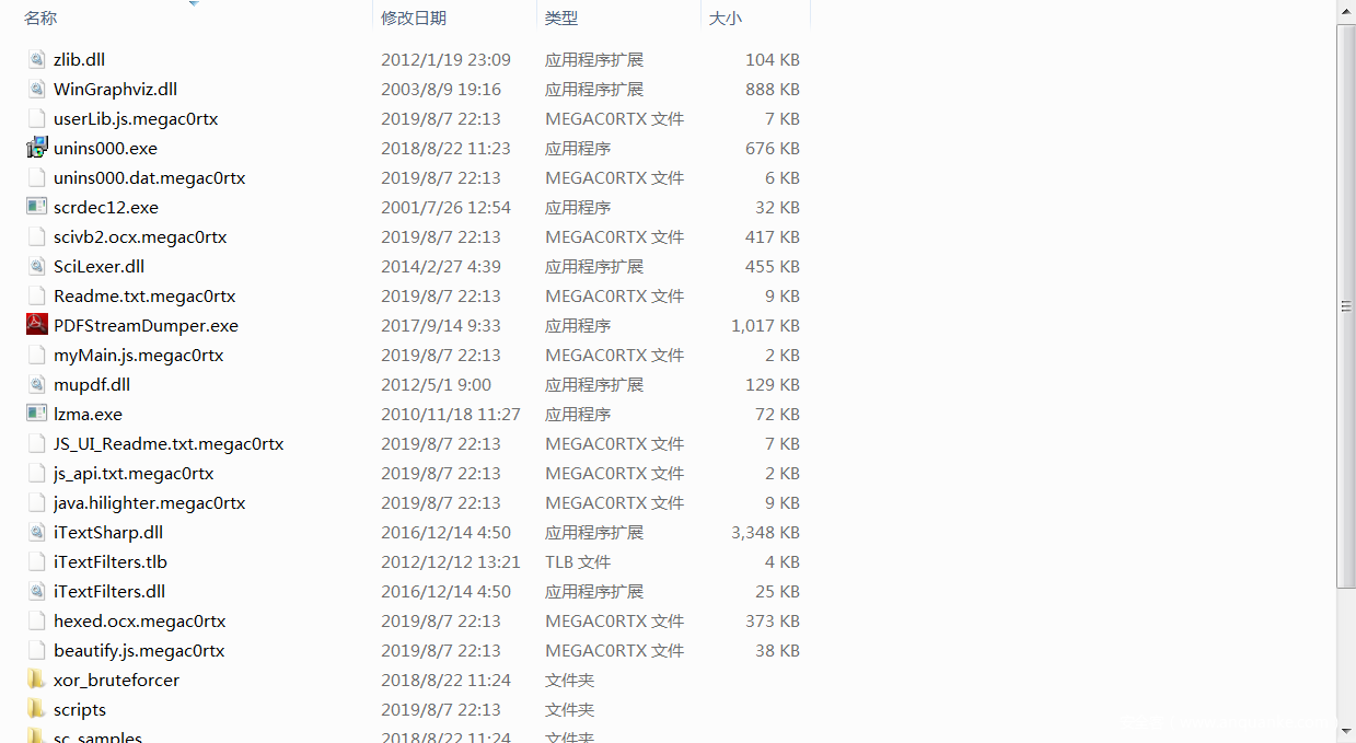 MegeCortex勒索病毒最早于2019年1月份被人在VT上发现,当时有人在VT上传了一个恶意样本,英国网络安全公司Sophos在5月份发布了一个关于MegaCortex勒索病毒的相关分析报告,笔者此前在分析的时候发现此勒索病毒早期的版本与去年非常流行的SamSam勒索病毒有一些类似,都使用了BAT脚本,同时都使用了密码参数,两款勒索病毒的负载加载的手法类似,不过暂时还没有更多的证据,证明两款勒索病毒存在关联,MegaCortex勒索病毒从1月份被人上传到VT之后,网络安全公司Sophos监控到此勒索病毒的数量一直在增加,并对此勒索病毒进行了详细的分析报道,该勒索病毒曾经对欧州和北美多个行业发起过勒索攻击,并要求支付高额的赎金,美国、加拿大、荷兰、爱尔兰、意大利和法国等国家的一些企业网络都曾受到此勒索病毒的攻击,2019年8月,发现MegaCortex勒索病毒V2.0版本,重新设计了负载的运行过程,它会自动执行不需要安装密码的要求,作者将密码硬编码在了二进制文件中,同时作者还加入一些反分析,以及阻止和杀死各种安全产品和服务的功能,此过程在之前的版本中是通过在在每个受害者主机上手动执行相关的批处理脚本来完成的,最新的版本不需要手动执行,都封装在了二进制程序中,此勒索病毒加密后的文件,如下所示: