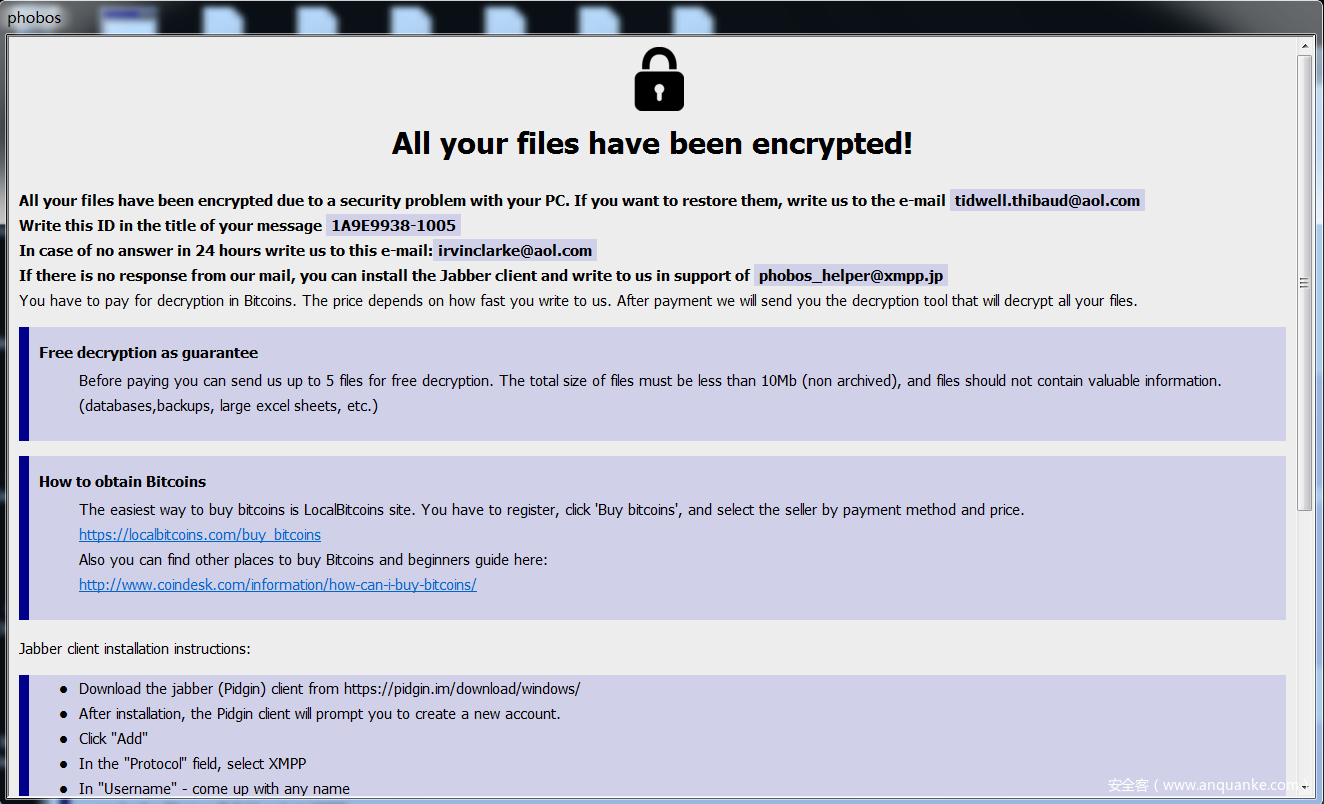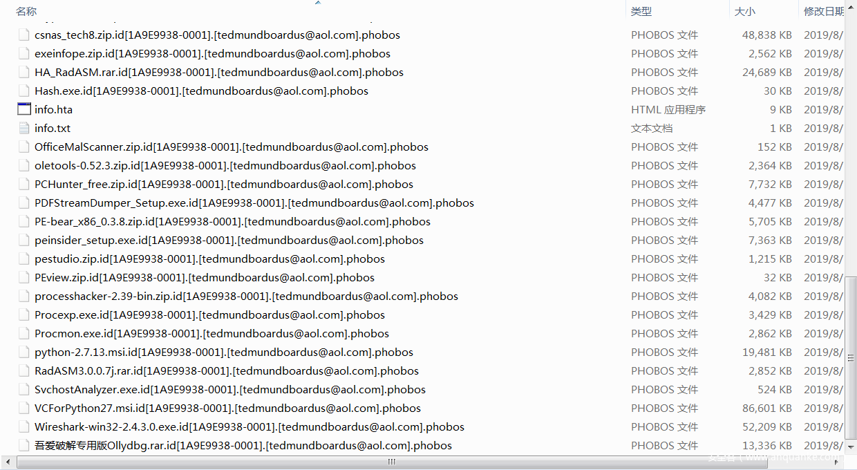 Phobos勒索病毒在2019年非常活跃,此勒索病毒首次出现是在2018年12月,国外安全研究人员当时发现了一种新型勒索病毒,加密后的文件后缀名为Phobos,这款新型的勒索病毒与CrySiS(Dharma)勒索病毒有很多相似之处,同样使用RDP暴力破解的方式进传播,两者使用了非常相似的勒索提示信息,所以很容易搞混淆,想要确认是哪个家族的勒索病毒,最好的方式就是捕获到相应的样本,然后通过人工分析进行确认,单纯的通过勒索提示信息,很难辨别,两款勒索病毒背后是否是相同的黑客团伙在运营,需要捕获到更多的证据,此勒索病毒加密后的文件,如下所示: