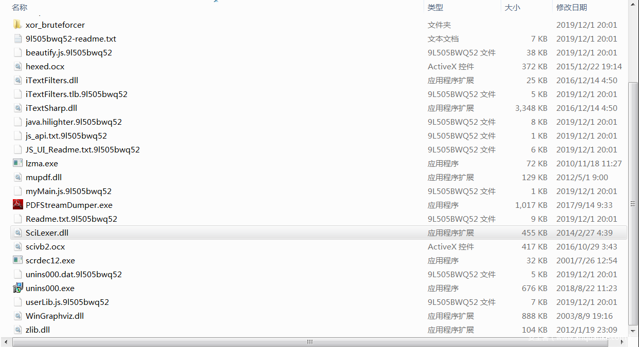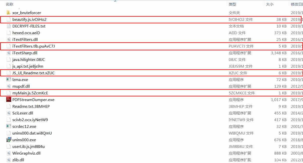 Globelmposter勒索病毒首次出现是在2017年5月份,主要通过钓鱼邮件进行传播,2018年2月国内各大医院爆发Globelmposter变种样本2.0版本,通过溯源分析发现此勒索病毒可能是通过RDP爆破、社会工程等方式进行传播,此勒索病毒采用RSA2048加密算法,导致加密后的文件无法解密,在随后的一年多的时间里,这款勒索病毒不断变种,2018年8月份出现了此勒索病毒的“十二生肖”版,2019年7月出现了此勒索病毒的“十二主神”版,两大版相差正好一年的时间,“十二主神”版后面又出现了一些小的版本变化,主要是加密后的文件后缀出现了一些微小的变化,此勒索病毒加密后的文件,如下所示: