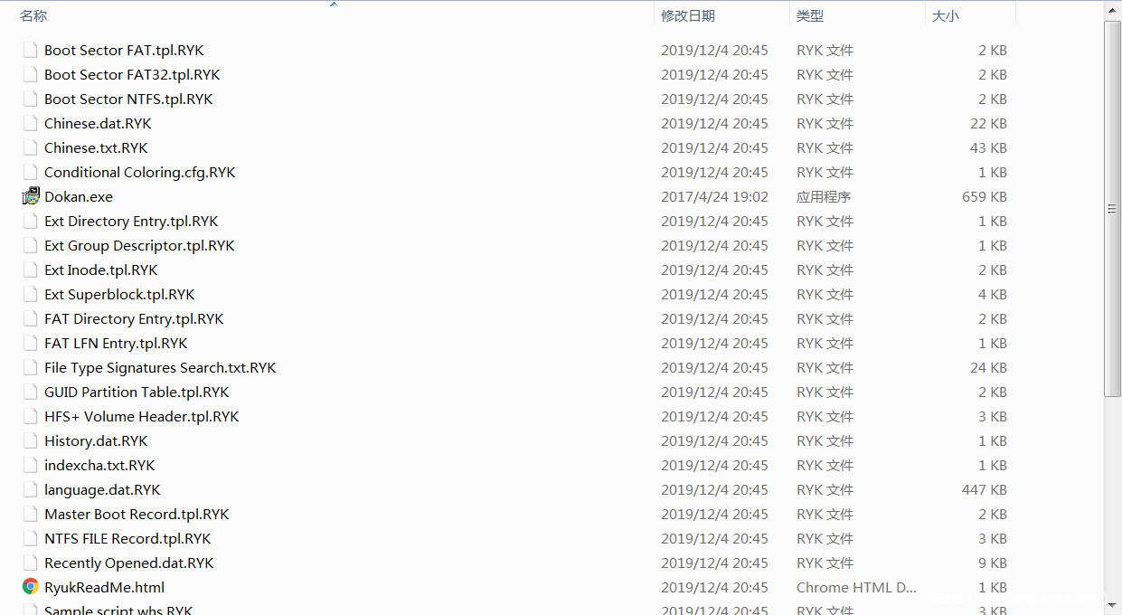 Ryuk勒索病毒最早于2018年8月被首次发现,它是由俄罗斯黑客团伙GrimSpider幕后操作运营,GrimSpider是一个网络犯罪集团,使用Ryuk勒索软件对大型企业及组织进行针对性攻击,C.R.A.M. TG Soft(反恶意软件研究中心)发现Ryuk勒索软件主要是通过网络攻击手段利用其他恶意软件如Emotet或TrickBot等银行木马进行传播,Emotet和TrickBot银行木马主要用于盗取受害者银行网站登录凭据,同时充当下载器功能,提供下载其它勒索病毒服务,为啥Emotet和TrickBot银行木马会传播Ryuk勒索病毒,因为TrickBot银行木马传播渠道的运营者是俄罗斯黑客团伙WIZARD SPIDER,GRIM SPIDER是俄罗斯黑客团伙WIZARD SPIDER的部门之一,此勒索病毒加密后的文件,如下所示: