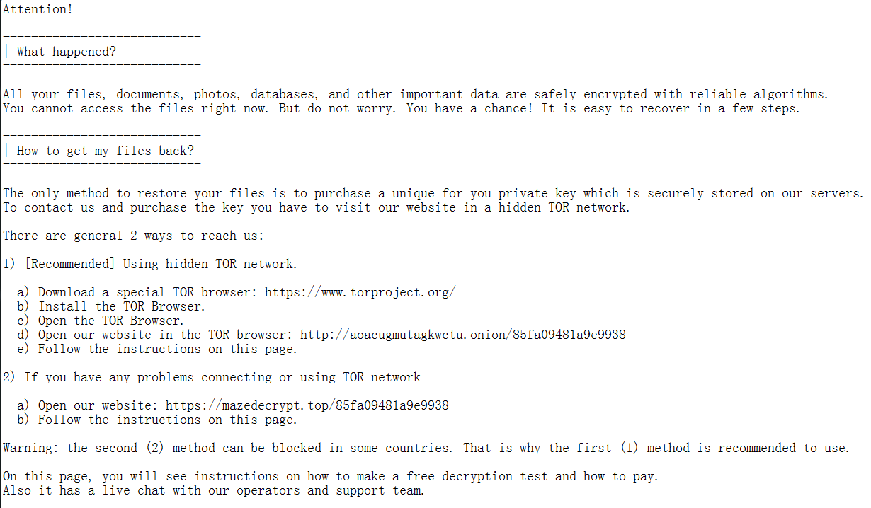 Maze(迷宫)勒索病毒,又称Chacha勒索病毒,最早于2019年5月份由Malwarebytes安全研究员首次发现,此勒索病毒主要使用各种漏洞利用工具包Fallout、Spelevo,伪装成合法加密货币交换应用程序的假冒站点或挂马网站等方式进行分发传播,最近的一段时间里,Proofpoint的安全研究人员发现一个新型的黑客组织TA2101,通过垃圾邮件的方式对德国、意大利、美国发起网络攻击,传播Maze(迷宫)勒索病毒,此勒索病毒加密后的文件,如下所示: