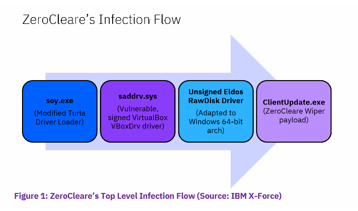 随后,攻击者便会在入侵设备上,开启横向扩散模式,部署ZeroCleare数据摧毁恶意软件,上演破坏性的数据擦除攻击。至于攻击细节上,一个叫EldoS RawDisk的合法工具包无形中成了ZeroCleare的推手。