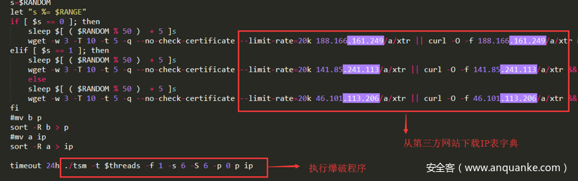 此次攻击中,攻击者通过爆破程序的扫描功能将IRCBot植入带有弱口令的设备,通过向失陷计算机植入IRCBot程序形成僵尸网络。和其他功能一样,</.rsync/c>目录为ssh爆破组件,依托Shell脚本进行初始化。<start>脚本由</.rsync/init>启动,然后创建脚本并命名为<aptitude>,运行之后启动<run>,进而执行关键脚本<go>。攻击者从第三方网站下载即将要爆破的IP表单和字典,将其作为<tsm>爆破工具的参数进行扫描和爆破,并时隔一天就会重新启动一次。<go>脚本代码如图6-1所示。