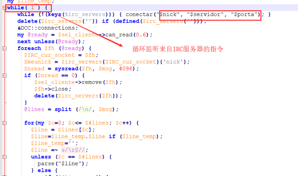 整个<rsync>的功能主要是设置循环,监听来自IRC服务器的指令,图5-5为后门中设置的循环监听功能。该工具结合c目录下的爆破工具<tsm>会将本地失陷计算机变成僵尸网络,向其它存在弱口令的设备植入IRCBot。