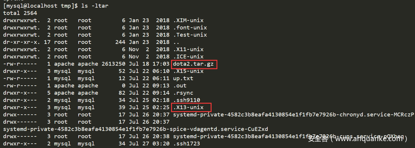 攻击者利用wget和curl指令从七个不同的URL下载恶意软件,这些URL下载的数据包中包含了与dota.tar.gz压缩包中同样的文件,如图3-3所示。利用这些URL,脚本随机选择其中一个URL,就可以下载有效载荷解压缩并执行。登陆被感染服务器,安全分析人员发现在X13-unix.tar.gz压缩包中包含了完整的挖矿组件,解压后的dota/.rsync目录中含有大量的恶意代码。攻击者为了掩盖痕迹,将恶意代码文件伪装成了系统指令,下文对恶意代码文件用<恶意代码文件>表示。