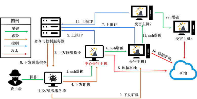 最近在单位测试环境中捕获一款新型挖矿病毒样本。经溯源分析,该挖矿病毒具有蠕虫属性,攻击者利用后门去控制失陷的计算机作为“肉机”,从3个固定的Web服务器来获取攻击的目标IP和所使用的爆破字典,之后通过不断感染其他目标形成僵尸网络。挖矿攻击过程如下图2-1所示: