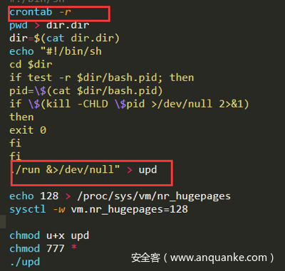 启动脚本<a>中包含了下一步需要执行的恶意命令,删除当前crontab文件,生成<udp>执行<run>,代码内容如图4-3所示。