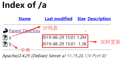 此脚本会利用wget和curl指令遍历相应的恶意服务器网站,从网站/a/xtr目录下载真正存放恶意文件地址,这些地址存放了攻击者实施爆破的IP地址和字典文件。研究人员发现攻击组织通过54.36.182.244(法国),51.75.28.134(法国),103.248.211.198(印度)三个服务器轮询下载IP表单和字典。轮询的三个地址都包含了相同的IP列表文件a和字典文件b,并且这两个文件在实时更新,如图6-2所示。