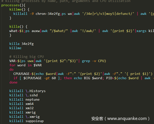 攻击者为了在挖矿计算期间独占CPU资源,</.rsync/a/init0>通过kill杀死其他矿机并进行删除,部分代码内容如图4-2所示。