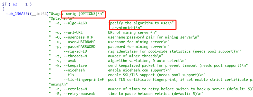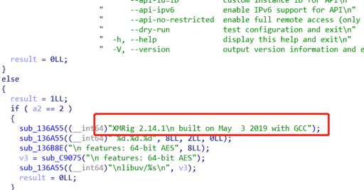 接下来是挖矿信息分析,挖矿病毒支持Cryptonight系列算法的币种挖矿,逆向分析发现,本次挖矿攻击使用的工具是基于XMRig 家族,编译时间戳为2019年05月03日,该样本今年才开始构建完成,如图4-5和图4-6所示。