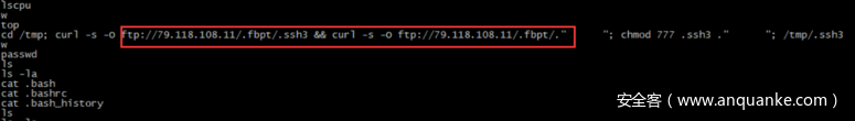 通过分析发现,此次攻击是一次有组织的攻击,攻击手段复杂多样,利用循环嵌套的方法在第三方网站隐藏真正存放恶意软件IP地址,目前只针对Linux物理机进行攻击,如果检测为蜜罐或者路由器则自动退出。攻击者通过ssh弱口令爆破取得系统权限后,利用ftp从其C&C服务器下载Shell脚本,为后续投递攻击载荷做准备。但是失陷计算机目录未发现“.ssh3”文件,分析人员怀疑攻击者在执行完脚本之后做了自身删除操作。图3-1所示为攻击者通过ftp下载命令。