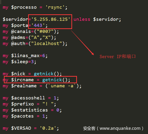 对混淆的代码进行梳理,代码中eval用来压缩二进制程序,所以只需打印可还原出关键代码。该脚本是一个基于perl的后门工具。rsync是通过开源的ShellBot工具生成,主要功能是通过监听服务器下发IRC指令执行其他的恶意行为。其ServerIP为5.255.86.125(荷兰),图5-3为解密后的IRCBot。