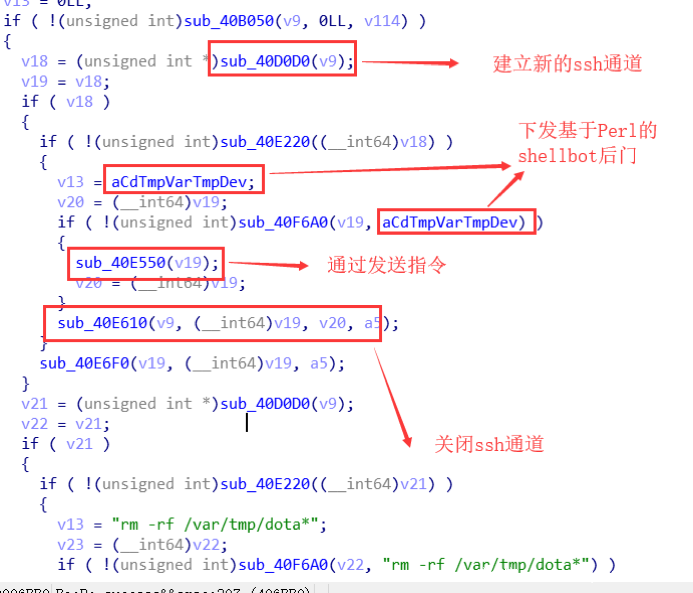攻击者一旦成功入侵计算机系统,就会想方设法通过各种方式连接到C&C服务器。命令和控制组件由一个基于perl脚本的IRCBot后门和可执行文件ps组成。IRCBot充当C&C连接到恶意IRC服务器,并且执行一些内置的命令进行反弹Shell。分析发现,可执行文件<ps>用于通过删除本地主机的.ssh文件夹并植入公钥来建立另一种持久性机制。总结而言,IRCBot作为辅助性的命令与控制,而<ps>则作为长期的后门工具。