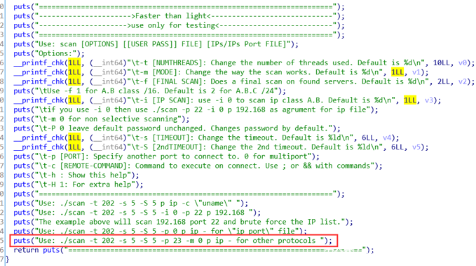 文件a中包含攻击者将要爆破的IP地址和端口号,IP数量固定为7万个。通过分析<tsm32>和<tsm64>(两个文件一样,简称tsm)可执行程序,作为爆破工具<tsm>可充当扫描器。<tsm>工具使用功能注释部分如图6-3所示,可以看到与<go>脚本中设置的命令一样。