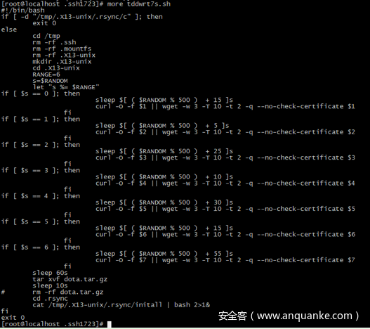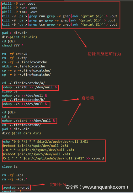 既然已经通过ssh爆破获得本地权限,那么后续则通过一系列脚本初始化本地系统、执行挖矿、安装后门和执行爆破。结合之前目录分析,使用</.rsync/initall>脚本初始化/var/tmp目录,并启动主脚本<init>;</.rsync/init>脚本执行过程如下: