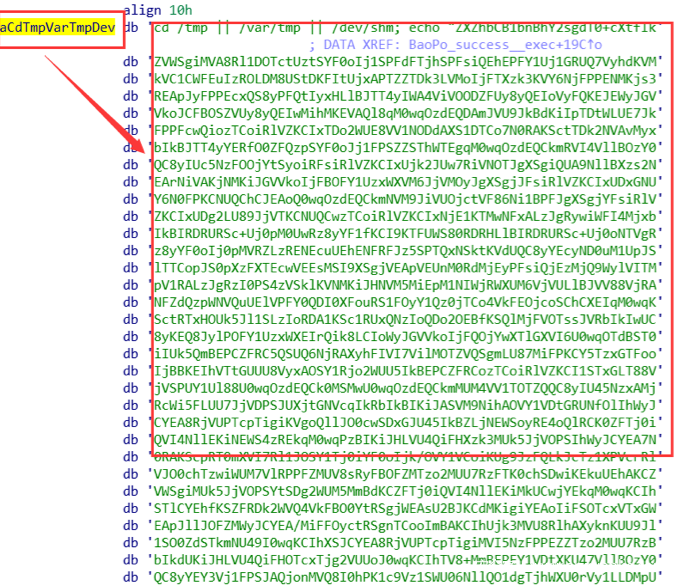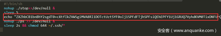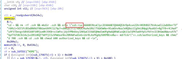 另外一个后门工具<.rsync/b/ps>是一个Linux可执行文件,为了保证日后可以密登录,攻击者将RSA公钥添加到失陷计算机.ssh目录中Authorized_keys文件中。<ps>后门植入RSA公钥代码如图5-7所示。