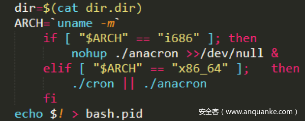 恶意脚本根据i686架构或x86_64架构判断当前系统环境,如图4-4所示,不同的系统环境启动不同的挖矿程序。cron和anacron功能相同,一个是32位版本,一个是64位版本,两者主要作用是执行挖矿操作,其他Shell脚本则负责清理和删除本地系统中存在的其他挖矿程序。