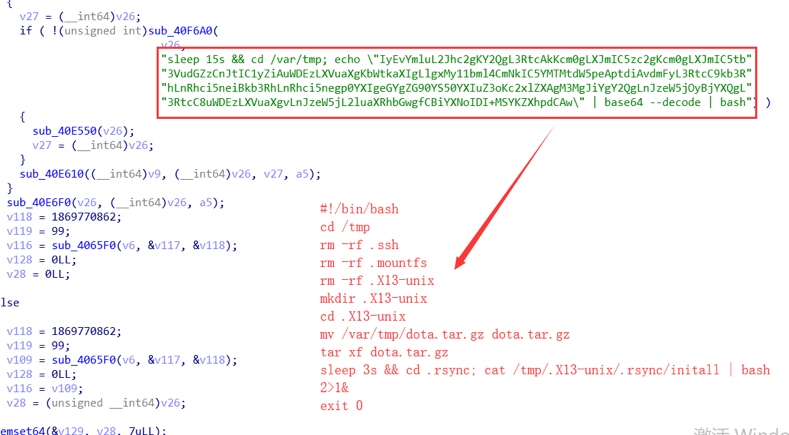 命令与控制初始化由</.rsync/b/a>启动<run>开始,该脚本首先解密出IRCBot(以下称rsync)工具,并随后启动ps后门。此次攻击者所使用的挖矿工具使用IRC指令进行命令和控制,通过<ps>将RSA公钥植入到本地失陷系统,以便保持长期登录。