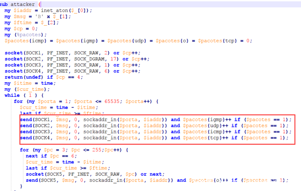 <rsync>工具中所使用的变量和注释是葡萄牙语。具有多种后门功能,其中包括单端口探测、全端口扫描、下载文件和执行远程Shell,除此之外,<rsync>似乎还具有DoS和TCPFlood攻击功能。图5-4为在<rsync>中发现的疑似DoS攻击。
