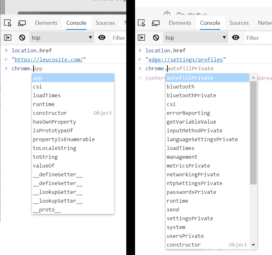 我们可以比较普通网站与Edge设置页面中的chrome对象,如下图所示: