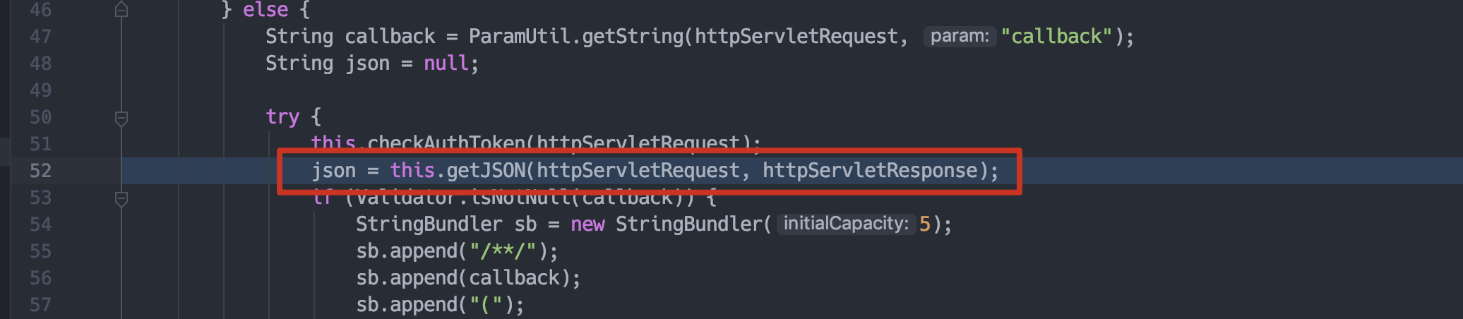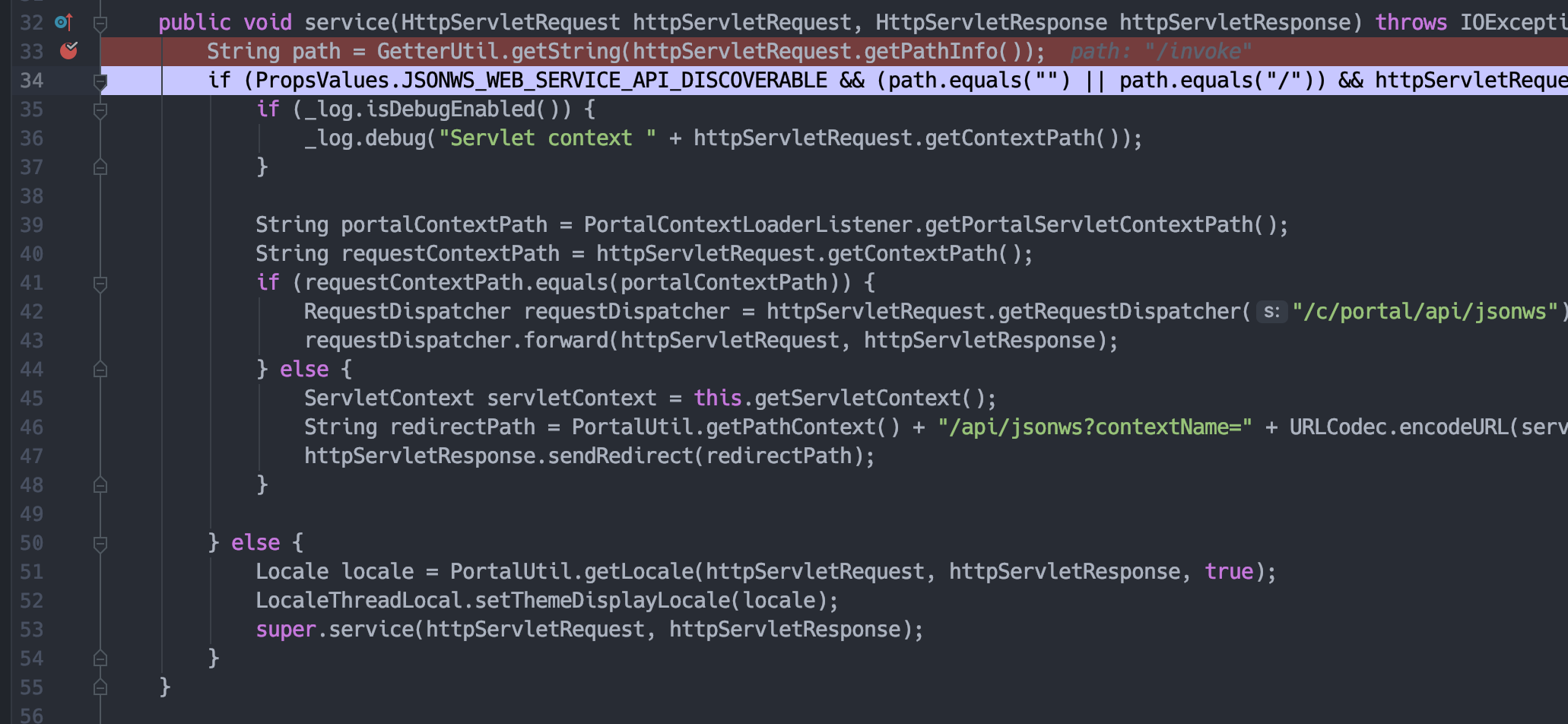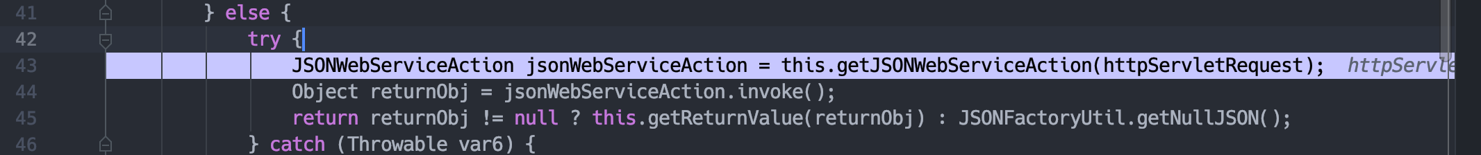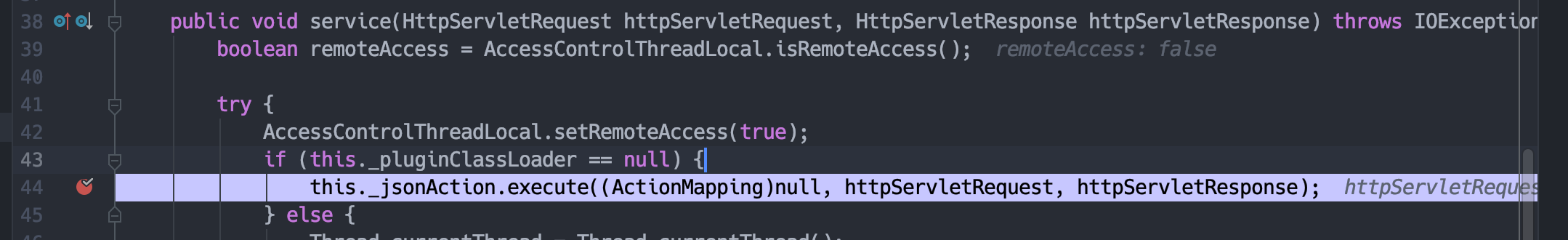 首先获取path,为/api/jsonws/之后的部分,由于我们请求的不是单纯的/api/jsonws,所以进入最下面else的部分,跟入super.service,也就是JSONServlet.service,跟入_jsonAction.execute。