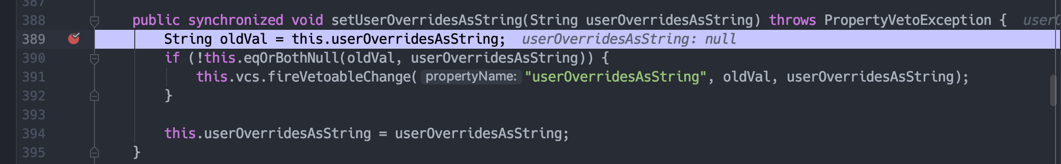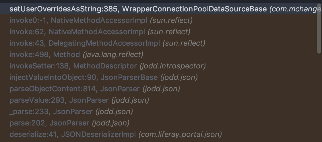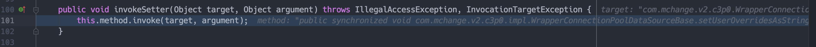 这里的setUserOverridesAsString方法是在我们传入的WrapperConnectionPoolDataSource方法的父类里进行调用的。 jodd.introspector.MethodDescriptor#invokeSetter