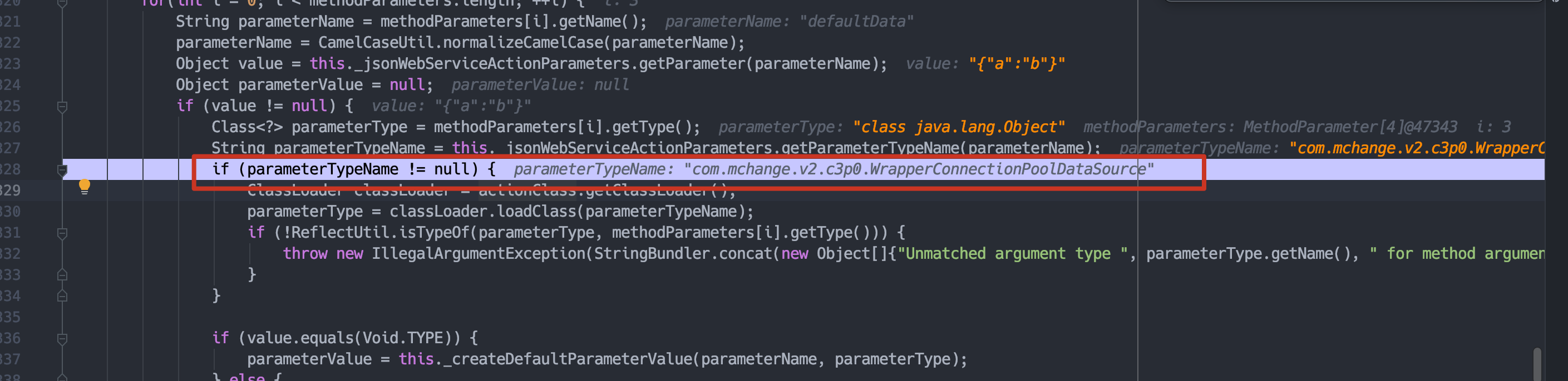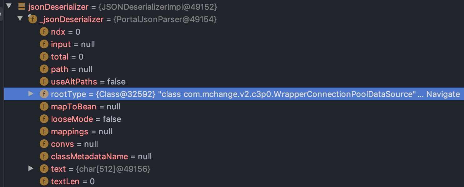 跳过了中间的coulmnId,name和type,直接看到defalutData。 parameterType是java.lang.Object,而parameterTypeName是之前从key的:后面部分提取出来的type,不为null,于是调用loadClass加载parameterTypeName。