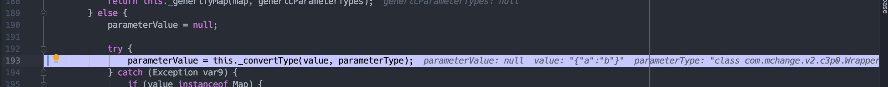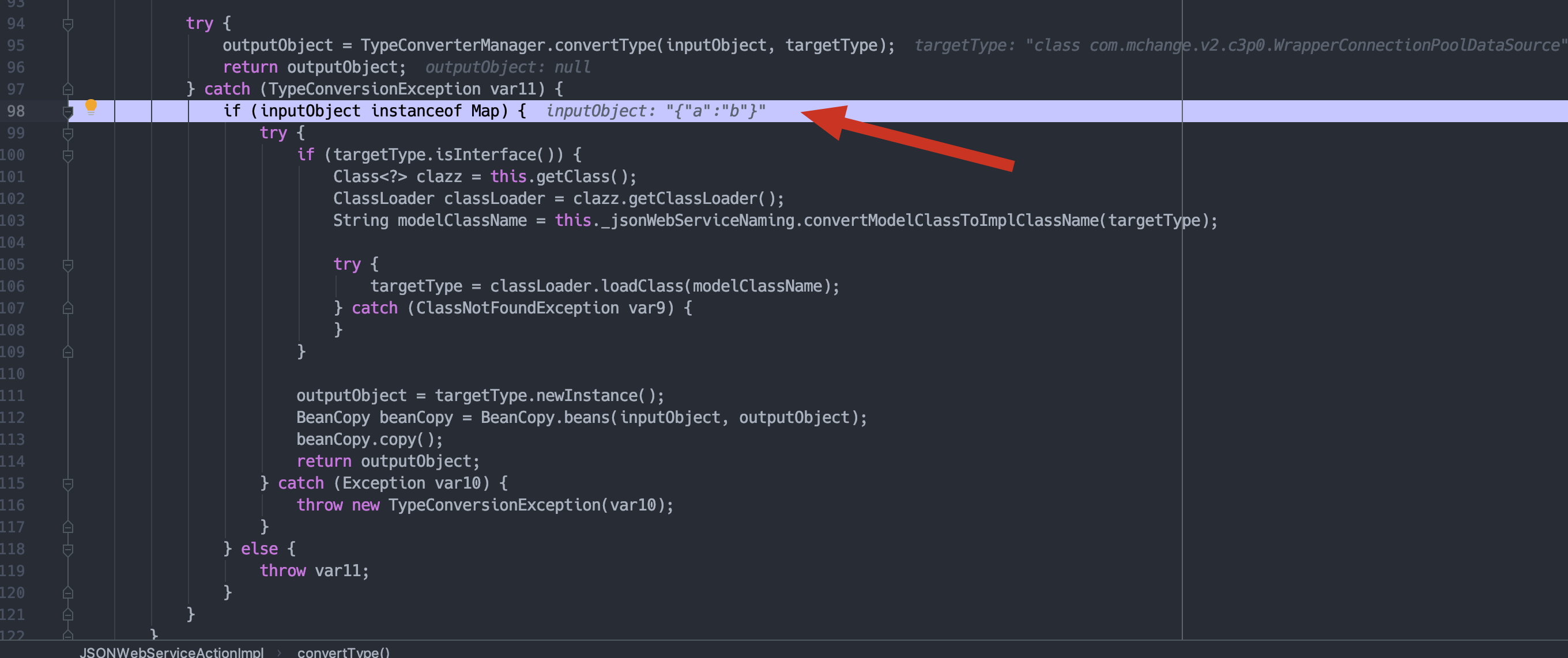回到_convertType,进行catch,输入类型不为Map,继续返回。