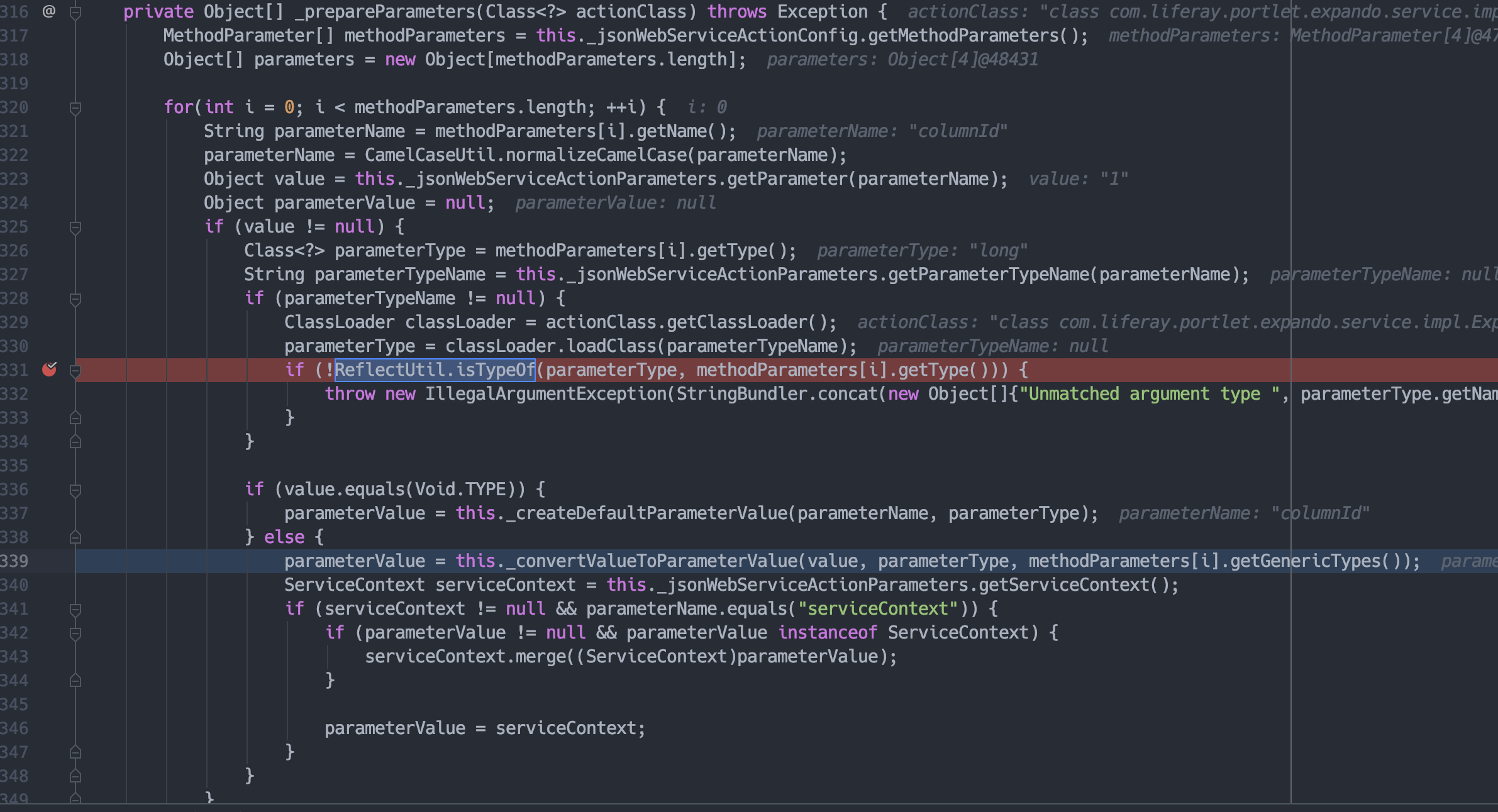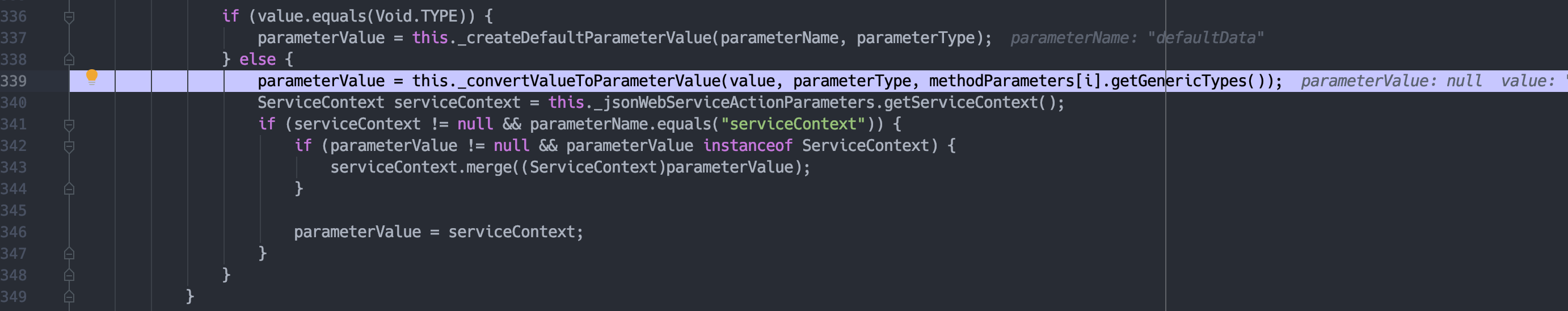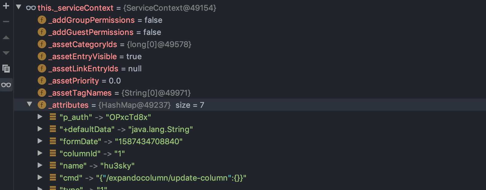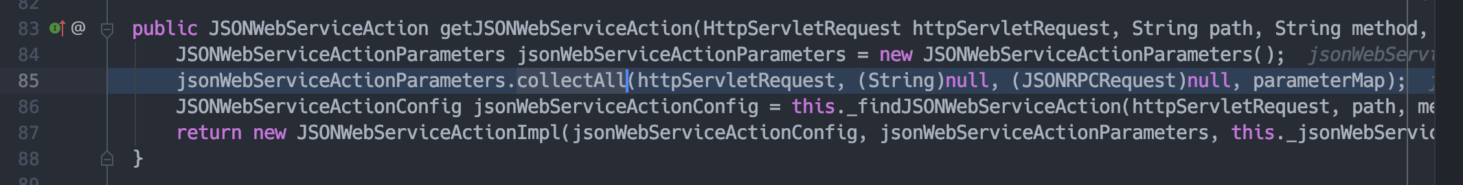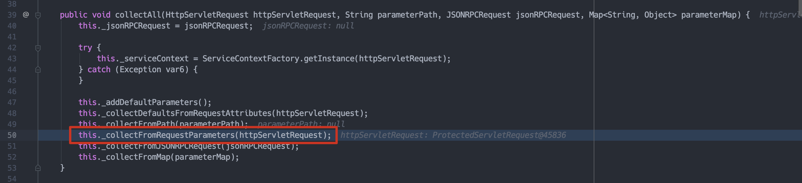 在collectAll函数里会把POST的参数赋值到jsonWebServiceActionParameters里,并存入上下文(com.liferay.portal.kernel.service.ServiceContext,里面有response,request对象相关,可以用来做回显)。