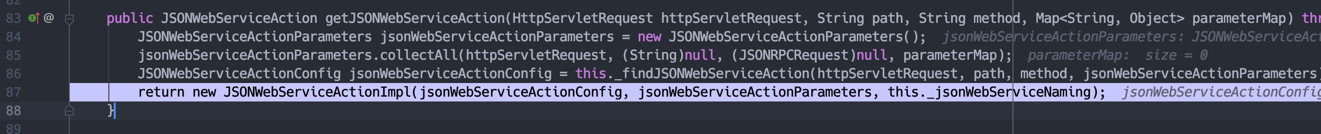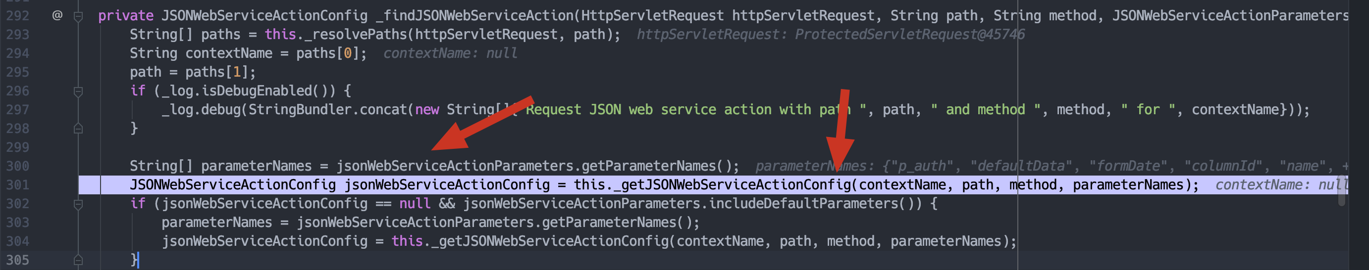 之后调用_findJSONWebServiceAction,传入jsonWebServiceActionParameters,path,获取parameterNames,调用_getJSONWebServiceActionConfig。
