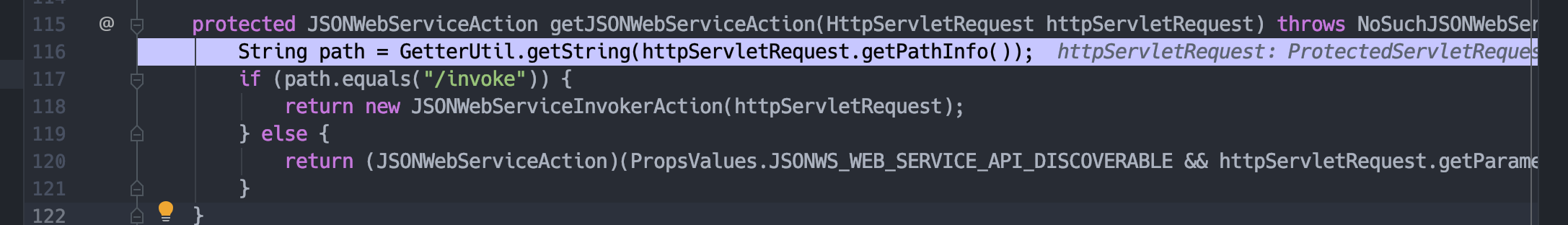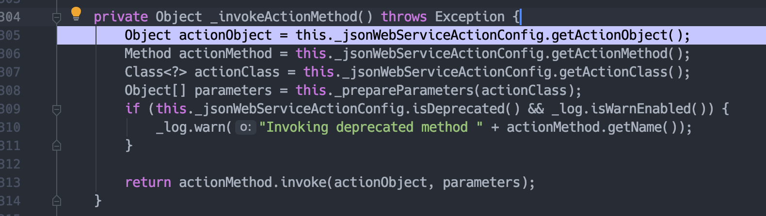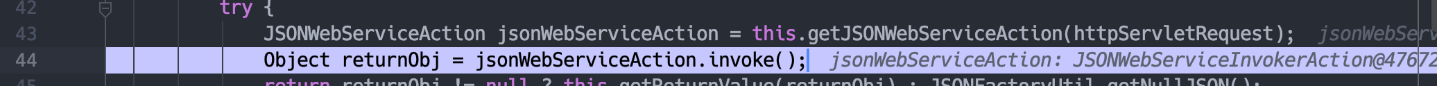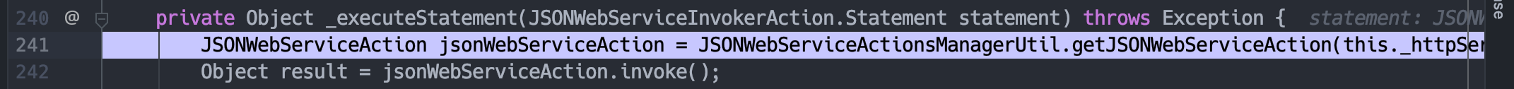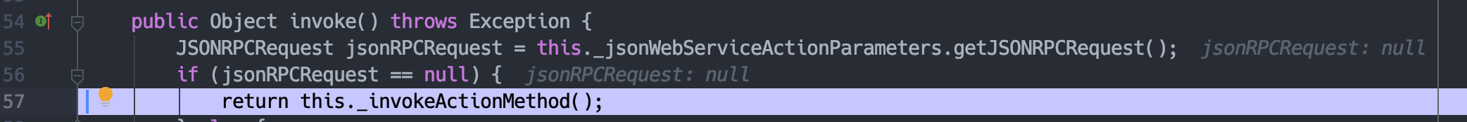 回到_executeStatement,进入JSONWebServiceActionImpl.invoke,jsonRPCRequest变量为null,调用_invokeActionMethod。