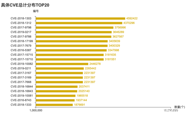 cve历年增长趋势中我们可以看到2020年的漏洞统计数量上已经高居首位那么应该2020年的漏洞影响范围最广。而实际情况更多的漏洞主要集中在2017年的cve编号上。说明了互联网整体服务软件更新相对要落后从而导致潜在安全隐患的软件未能及时更新升级打补丁。