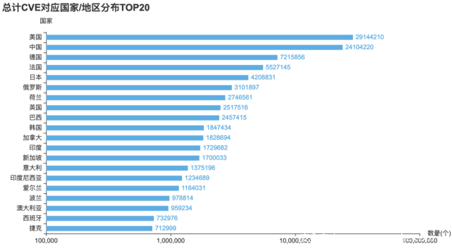 全球地区cve漏洞风险影响主要集中在美国,中国,德国、法国和日本。