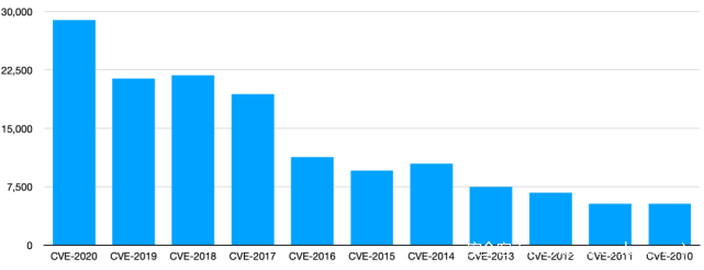 通过上图整体趋势我们可以看出历年漏洞数量整体还是持续增长,并且在10年中最明显的变化是2020年,cve数量已经超过2010年数量的5倍多。
