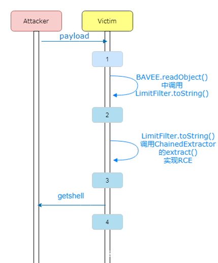 通过构造链式的ChainedExtractor就可以实现任意代码执行。LimitFilter中的toString()方法会调用m_extractor的extract(),而BadAttributeValueExpException的readObject()中可以调用其成员变量的toString()。
