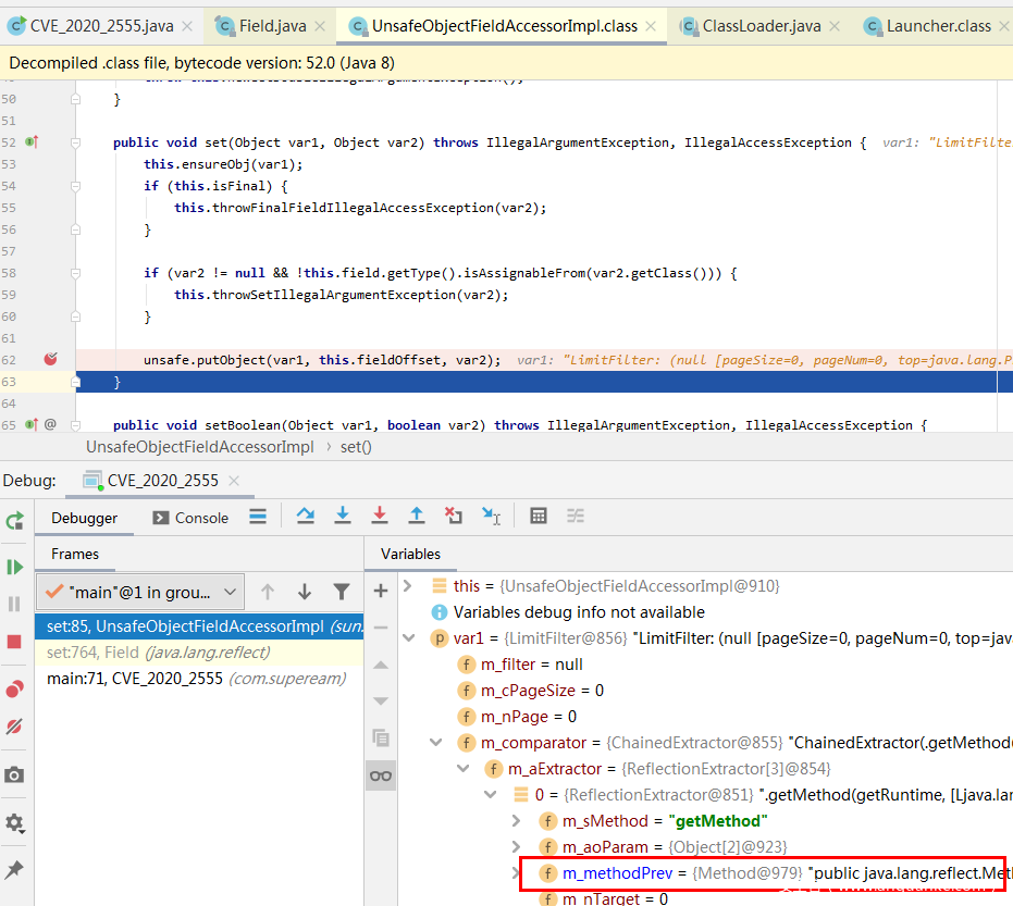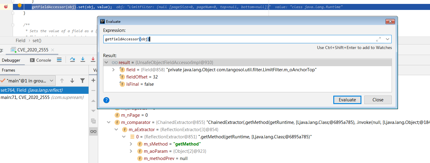 在执行getFieldAccessor(obj).set(obj, value);之前,m_methodPrev的值都没有改变,问题的范围又得到了缩小,