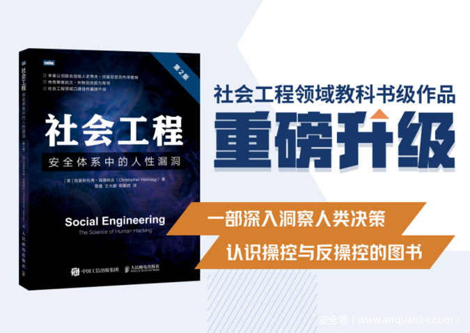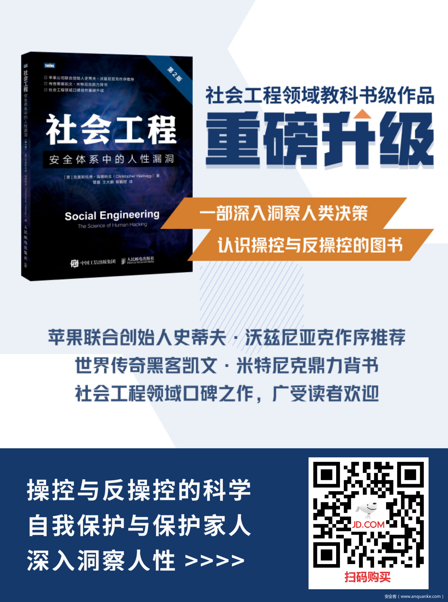 至于作者克里斯托弗·海德纳吉(Christopher Hadnagy),正是因为其深厚的专业背景,以及多年来在社会工程领域的实践,方能成就这部经典之作。知名信息安全专家,Social-Engineer有限公司CEO,业内影响广泛的社会工程框架Social-Engineer的主要开发者,有近30年的安全和信息技术实践经验。另著有《社会工程 卷2:解读肢体语言》及《社会工程:防范钓鱼欺诈(卷3)》,深受读者欢迎。他创办了DEF CON极客大会,建立了DerbyCon安全大会中的“社会工程村”,同时参与创办了社会工程夺旗赛。各大网店有售,以下给出京东的购买链接,扫描二维码即可购买。![]()