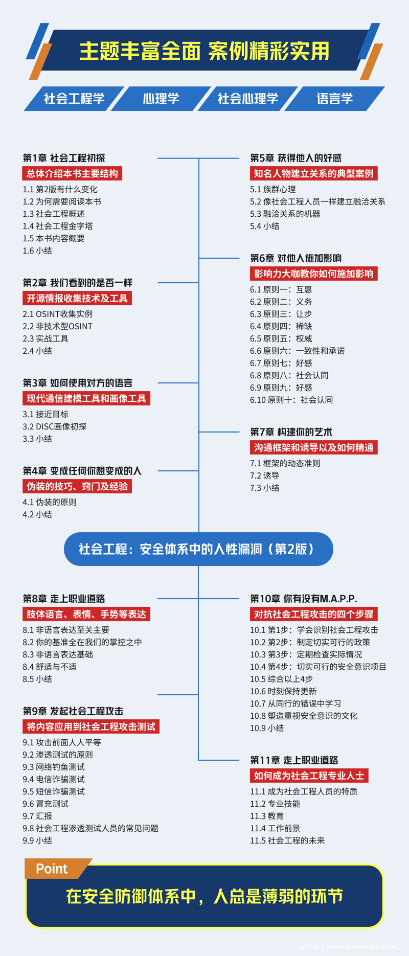 李小龙在 20 世纪 60 年代来到美国。那时的种族偏见非常严重,而他又在尝试一些开创性的事情:将截拳道传授给不同种族、肤色或国籍的人。在大学里,他和那些自以为很懂格斗的同学交手,并击倒了一个又一个对手。这些对手中的一部分人最终甚至成了李小龙的朋友或学生。这告诉我们什么呢?人们必须适应新的格斗方式,不然就会一直被击败。李小龙的学生有没有可能利用李小龙的新式格斗术伤害他人、为非作歹呢?有,但李小龙觉得教育他人势在必行,因为这样他们才能得到真正的保护。因此,我对“你不担心你发表的内容被坏人利用吗”这个问题的回答一如既往:如何利用从书中学到的知识,选择权在你自己,但是那些善良的人需要有人来帮助并指导他们。要想懂得如何抵御这种新型攻击,你要学会的不仅是怎样接招。就像截拳道宣扬的那样,你需要在学习攻击、学习防守,以及掌握攻击和防守的时机这三者之间找到平衡。当你学习成为一名社会工程人员时,你需要有能力像坏人一样思考,同时又谨记自己是个好人。一个比方就是,你需要足够强大,让原力与你同在,但又不会被黑暗力量吞噬。为这本书背书的大咖中有两位极为知名,一位是世界知名极客沃兹尼亚克,另一位是全球头号黑客米特尼克。“黑客行为已经存在很久了,而社会工程行为更是自人类出现就一直存在。本书能武装你、保护你,并教你识别、抵御和降低来自社会工程的风险。” ——史蒂夫·沃兹尼亚克,苹果公司联合创始人“我从20世纪70年代后期就开始在实践中运用社会工程。然而直到今天,社会工程手段仍是进行渗透测试的利器,它对个人及组织安全影响重大。这本书涵盖从基础的OSINT到渗透测试的方方面面,任何对社会工程感兴趣的人都应该读一读。”——凯文·米特尼克,社会工程之父,《反欺骗的艺术》作者