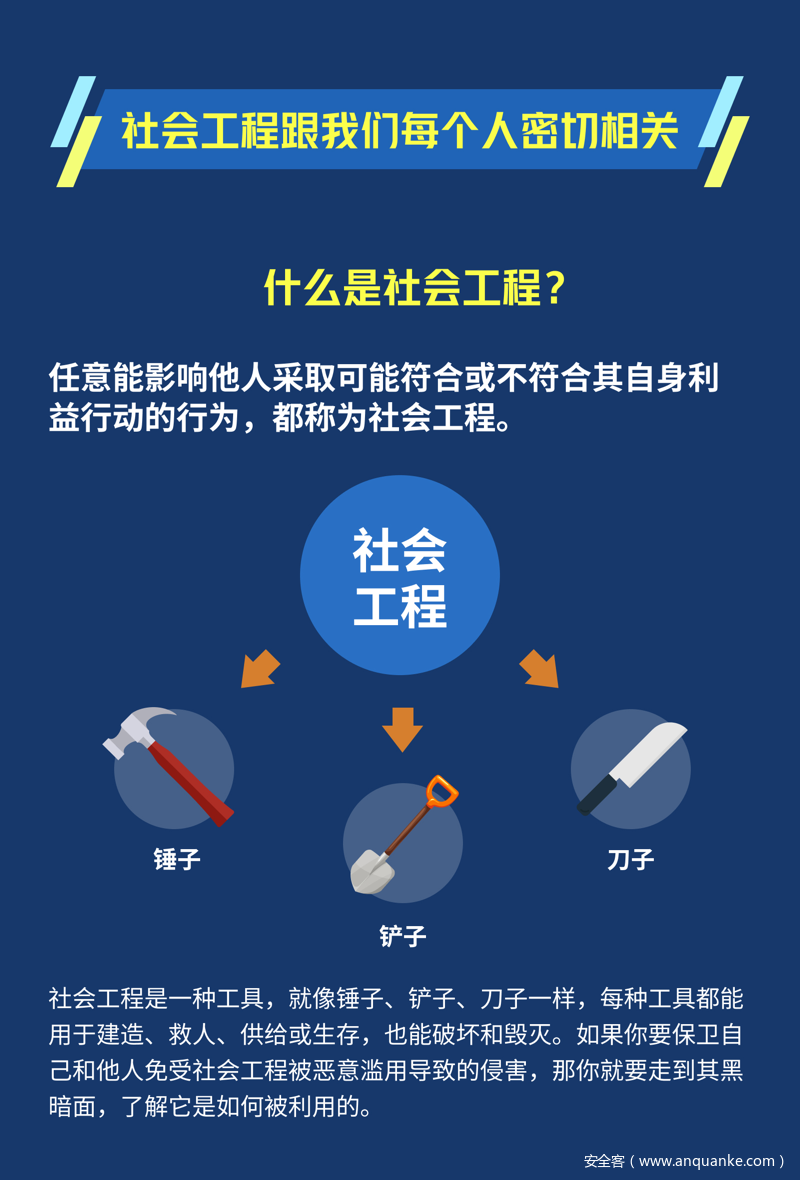 《社会工程:安全体系中的人性漏洞》一书给出的定义:任意一种能影响某人采取可能符合或不符合其最大利益行动的行为,称为社会工程。这个定义非常宽泛。要知道,社会工程不仅仅是负面的。