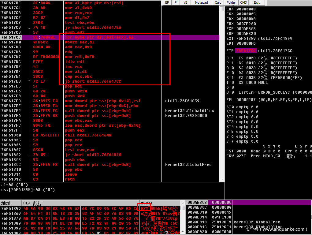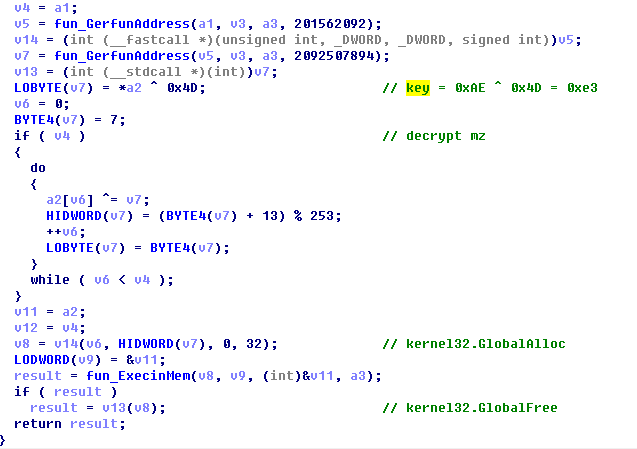 通过加密PE第一个字节与0x4D做XOR操作获取PE的解密Key,并解密出最后的PE文件: