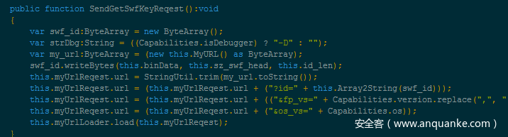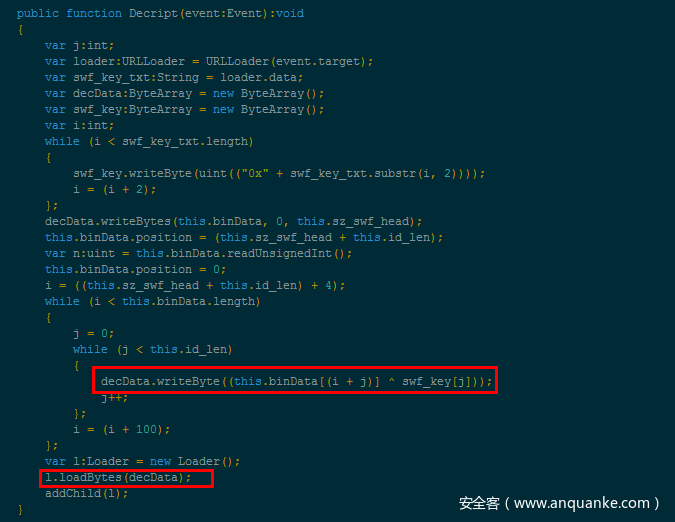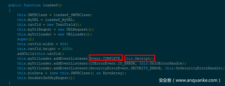 此SWF本身是一个loader,运行前初始化了一个URLrequest实例,实例设置了对应的完成事件,通过该实例和远端服务器通信获取Exploit的解密秘钥后,调用Decrypt解密对应的Exploit代码: