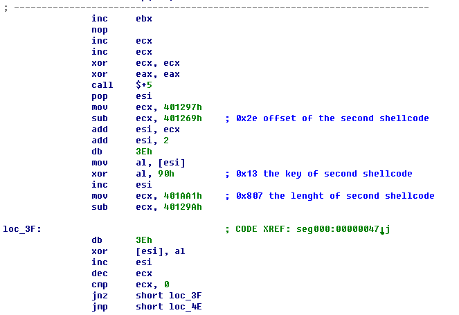 注入的数据开头是一段加载代码,主要功能是重定位以及通过XOR解密之后的第二段Shellcode,解密密钥通过加密Shellcode第一个字节与0x90 XOR操作获得: